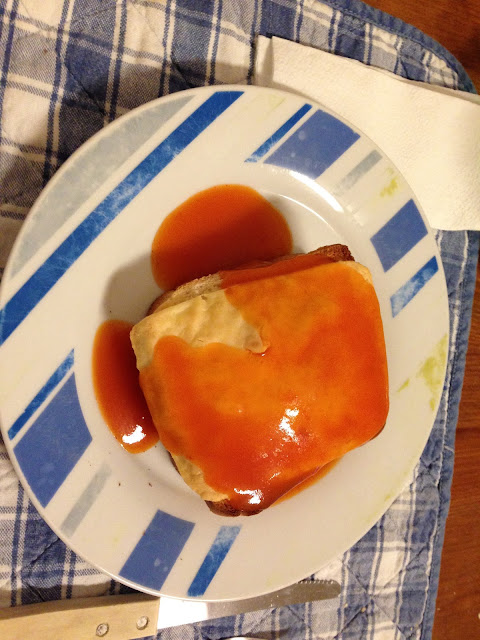 Aqueça o molho da francesinha (usei da marca Guloso - é bastante picante) e deite por cima da nossa sandes no forno ;)