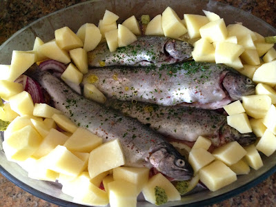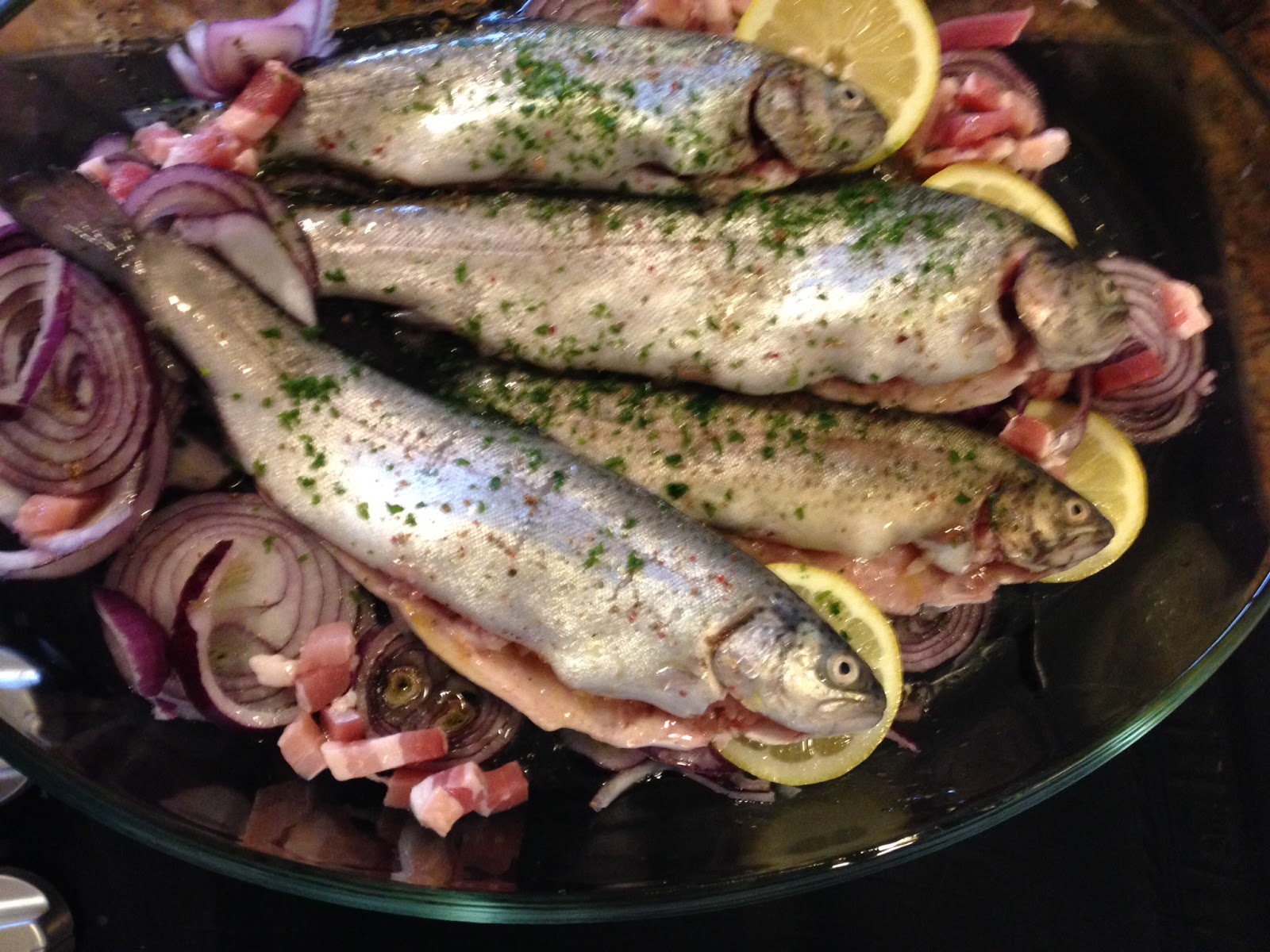 Num pirex, coloque 50g de bacon, 1 cebola roxa às rodelas e 4 rodelas de limão. Coloque as trutas no tabuleiro e tempere com mistura de 5 pimentas moídas na altura, salsa picada, um pouco de vinho branco e um fio de azeite.