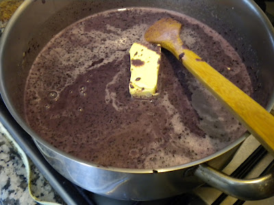 Mistura-se muito bem a farinha com o açúcar e os cristais de baunilha, adiciona-se o ovo e o vinho do Porto e dissolve-se tudo muito bem no leite. Por último, junta-se as amoras trituradas e a margarina e leva-se ao lume a engrossar.